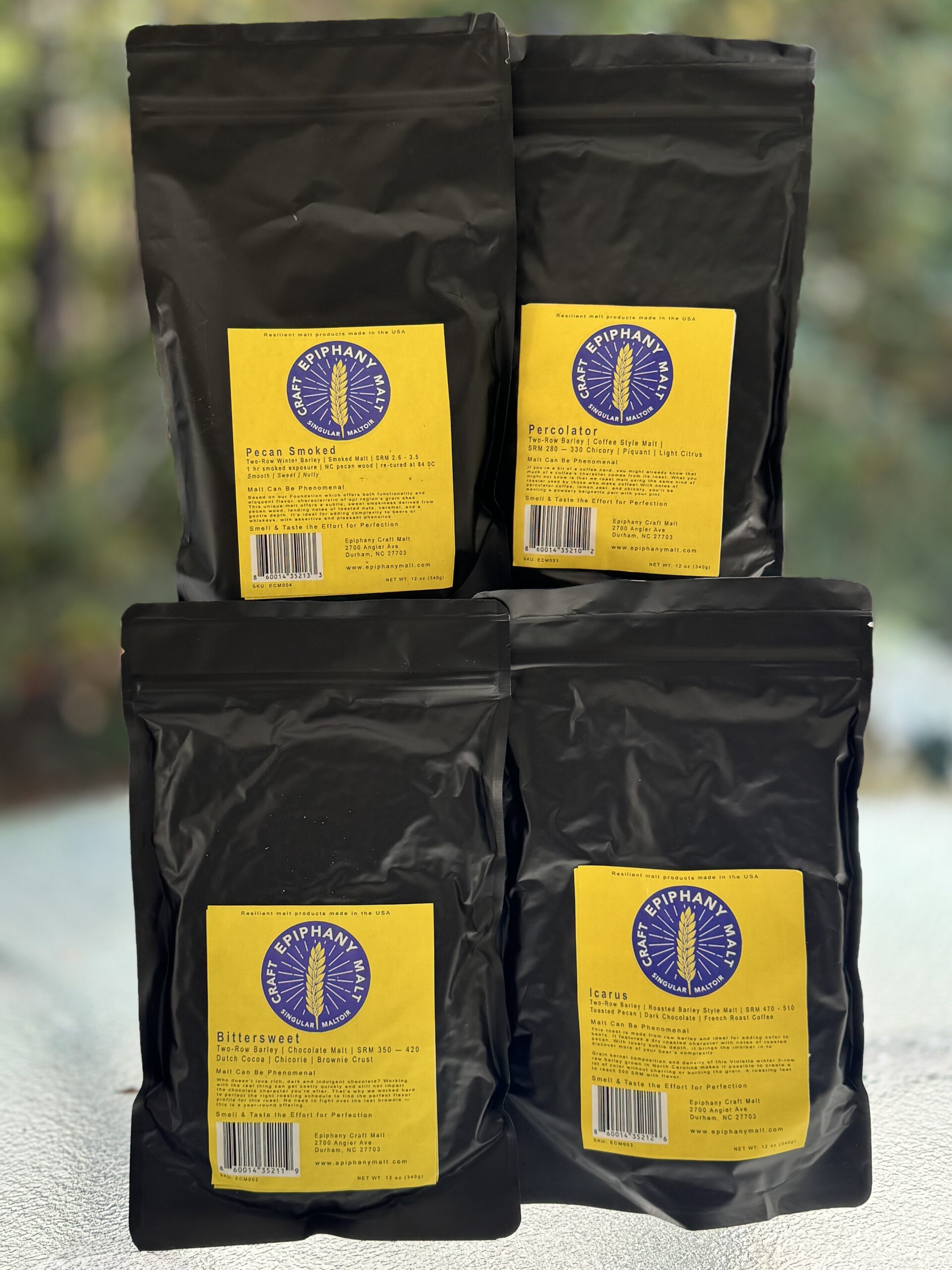 Up your home brew game with fine malts from Epiphany Craft Malt in Durham, NC. Used for years by award-winning regional breweries such as Burial Brewing, Fullsteam Brewery and Noda Brewing Company, Epiphany’s small-batch ingredients are now available by Bouncer to home brewers nation-wide. If you’ve been looking for a way to radically improve your home brew, these premium ingredients WILL kick your beers up a notch! Each premium flavor is available in resealable, opaque and airtight 12 ounce bags to maximize shelf life.